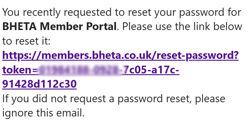 You should receive an e-mail from BHETA Member Portal (info@bheta.co.uk) titled ‘Reset your password for BHETA Member Portal’. Contact info@bheta.co.uk if you're not receiving the link.